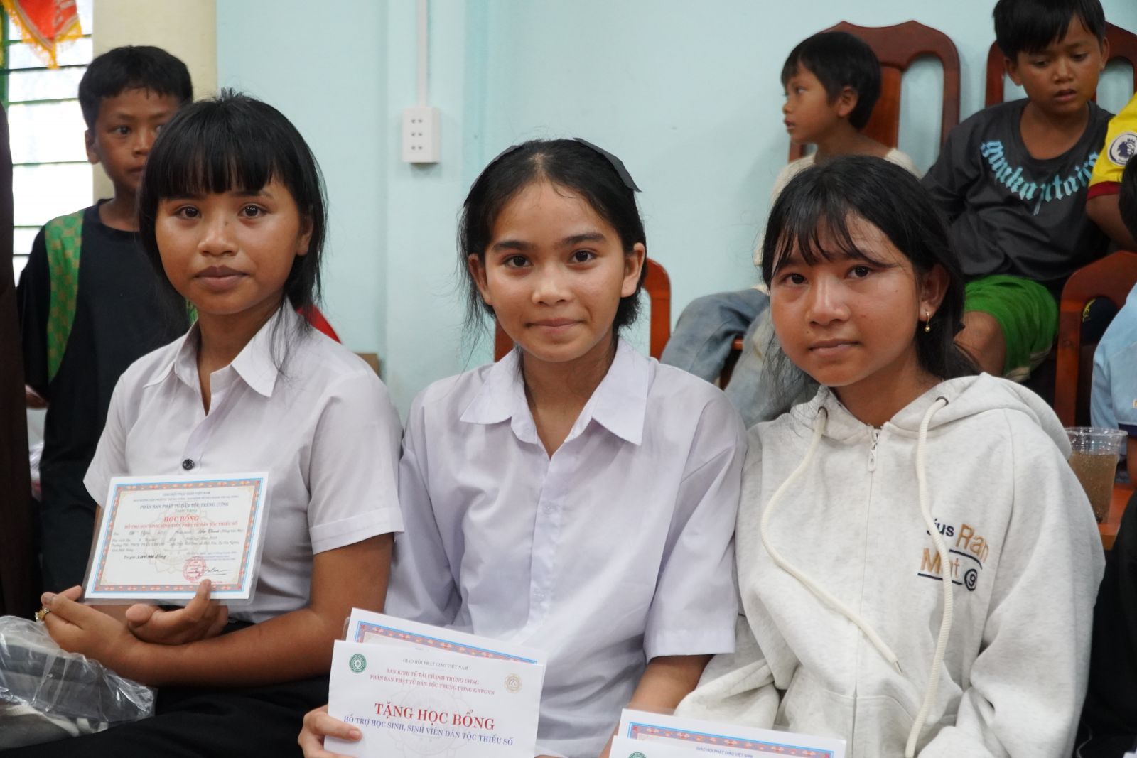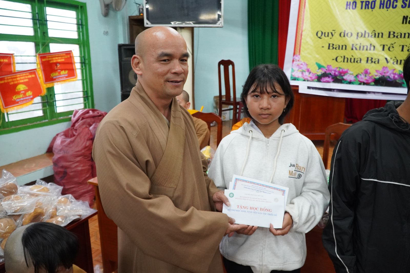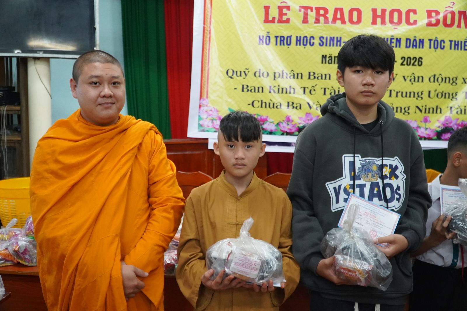 Số tiền học bổng được chư Tôn đức Phân ban trao làm hai đợt để hỗ trợ kịp thời cho các em: 2 triệu đồng được trao trong đợt I (học kỳ 1) và 1 triệu đồng được trao tiếp trong đợt II (học kỳ 2). Đây là sự hỗ trợ thiết thực, giúp các em trang trải chi phí học tập và chuyên tâm đến trường.